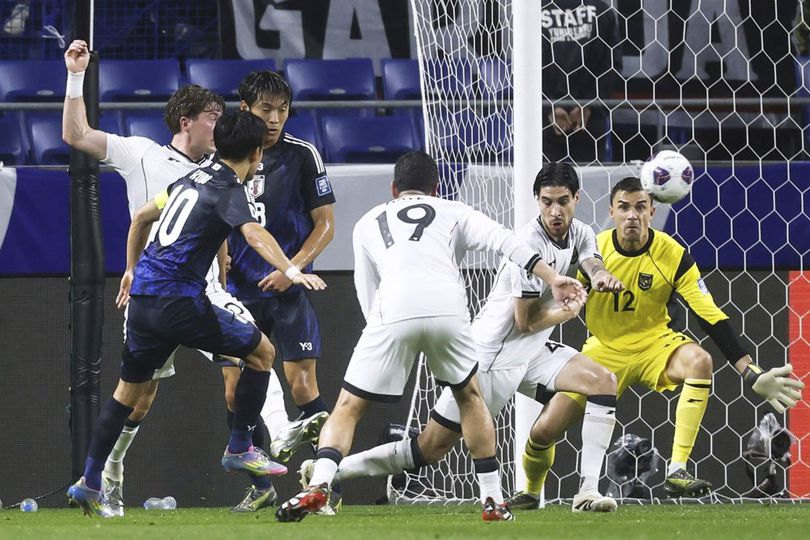 Momen saat gelandang Jepang, Takfusa Kubo, menjebol gawang Timnas Indonesia, Selasa (10/06/2025). (c) Yu Matsuda/Kyodo News via AP