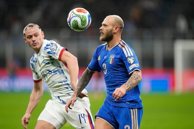 Federico Dimarco (Italia) berebut bola dengan Julian Ryerson (Norwegia) dalam laga Grup I Kualifikasi Piala Dunia 2026 di San Siro, 17 November 2025 (c) AP Photo/Luca Bruno)