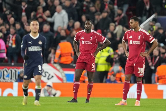 Dua pemain Liverpool, Ibrahima Konate dan Ryan Gravenberch tampak kecewa setelah PSV mencetak gol ketiga melalui Couhaib Driouech pada laga Liga Champions. (c) AP Photo/Jon Super
